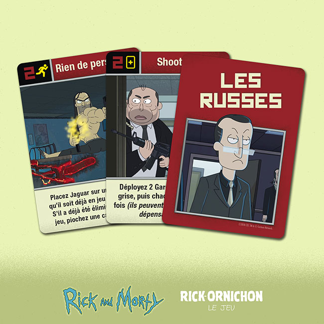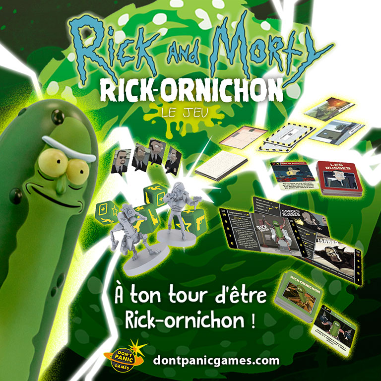 Après avoir édité Rick et Morty : Total Rickall, et en attendant la sortie des 100 jours de Rick et Morty fin septembre, on vous propose dès aujourd’hui le tout nouveau [Rick et Morty : Rick-ornichon le jeu]. De quoi réjouir tous les fans de la série Rick & Morty mais aussi tous ceux qui aiment les jeux asymétriques avec des tuiles, des cartes, des dés… et des Russes !
