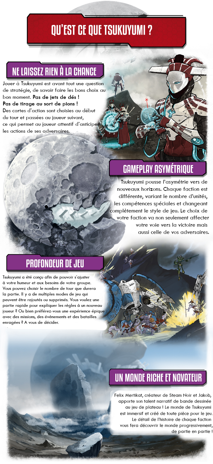 Tsukuyumi : Full Moon Down est un jeu de plateau exceptionnel se déroulant dans un univers conçu et réalisé de toute pièce par l’auteur et artiste Felix Mertikat. Dans un futur ou la Lune s’est écrasée sur la Terre, le monde est bouleversé par un chaos dévastateur, l’humanité a été décimée et de nouvelles espèces mutantes se sont développées.