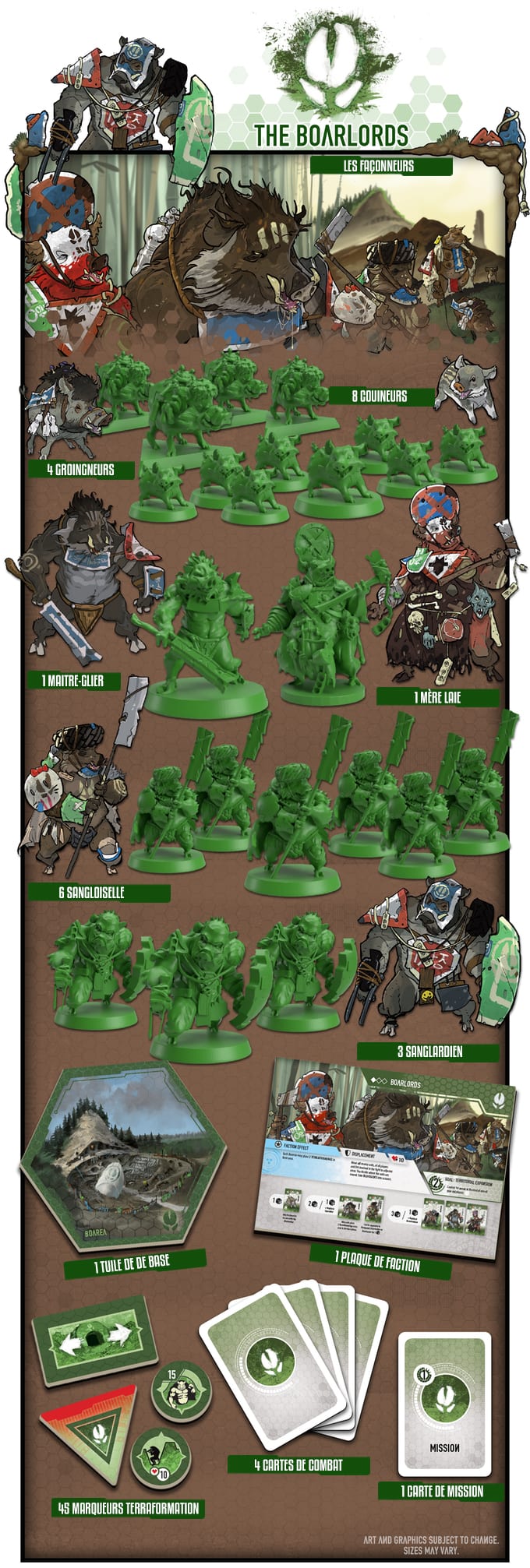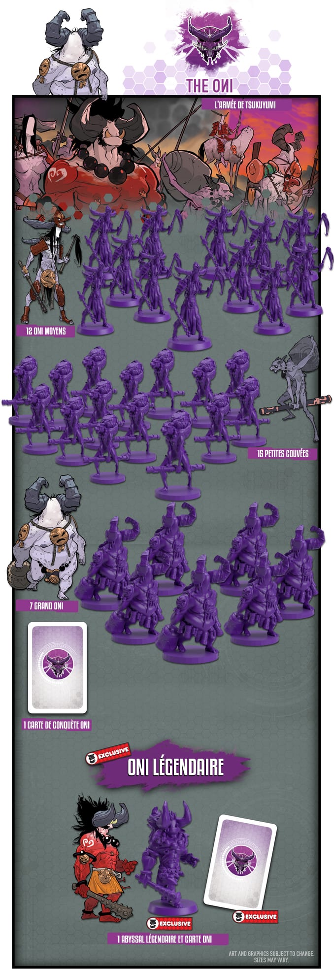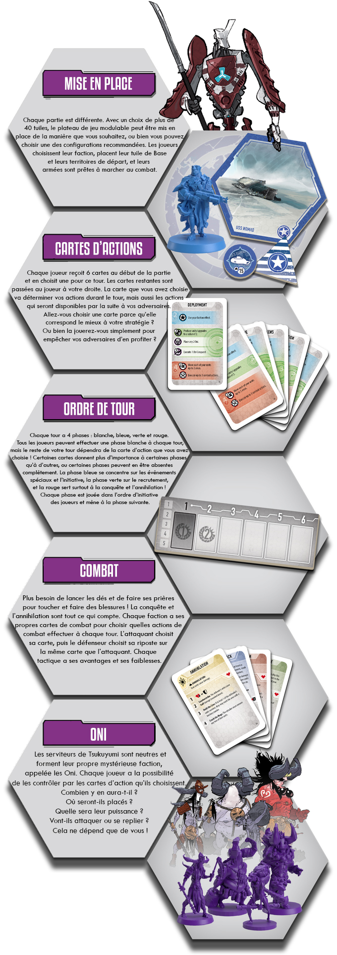 Il s’agit d’un jeu centré sur la stratégie, l’habileté des joueurs et les caractéristiques uniques de chaque faction. Allez-vous submerger le champ de bataille avec les terribles essaims de la Nuée Noire ? Ou bien allez-vous profiter de la mobilité, des armes et des tactiques des Nomades pour dicter votre volonté à vos adversaires ? Peut-être préférez-vous l’approche scientifique pure et les avantages technologiques des Cyber-samouraïs, ou bien encore la sauvagerie et la ténacité des Seigneurs sangliers. Quel que soit votre choix, tous devront combattre les Oni, serviteurs du dragon blanc qui se cache dans la Lune !