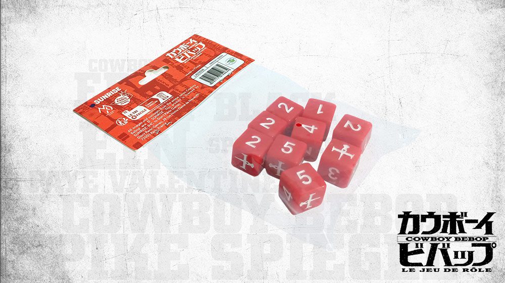Dés pour le jeu de rôle Cowboy Bebop. Grâce à ces dés les Chasseurs et Chasseuses de Primes de tout l’univers pourront foncer vers de nouvelles aventures !